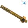 Описание и особенности: Детали, входящие в комплект клинового анкера, изготовлены из оцинкованной стали, дополнительно защищенной пассивацией. В конструкцию крепежа включена подвижная втулка распорного элемента, внутрь которой помещен конический клин со шпилькой на противоположном конце. На ее резьбу надета плоская шайба и навинчена шестигранная гайка. До начала монтажа анкера в несущих основаниях сверлят глухую скважину с глубиной, равной высоте крепежа. Затем клиновый анкер полностью забивают в отверстие, ударяя молотком по торцу шпильки. После этого при помощи торцевого гаечного ключа до упора затягивают гайку. При этом конусная часть клина смещается внутрь втулки и плотно прижимает ее распорный элемент к стенкам отверстия. Далее гайку откручивают и снимают вместе с шайбой, на шпильку одевают проушину кронштейна и вновь затягивают резьбовое соединение.