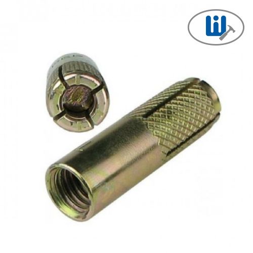 Описание и особенности: Забивной анкер с внутренней резьбой предназначен для резьбовых соединений с помощью метрических болтов и шпилек соответствующего диаметра. Распорная зона анкера оснащена сетчатой рельефной насечкой, поверхность стального анкера оцинкована и обработана по технологии желтой пассивации.