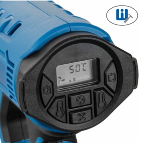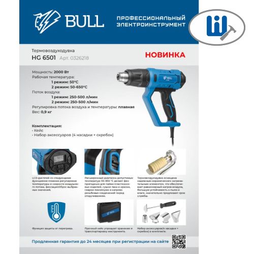 Термовоздуходувка BULL HG 6501 набор сопл 0326218 оснащена LCD-дисплеем со следующими функциями: плавная регулировка температуры и скорости воздушного потока, фиксация/сброс выбранных значений.