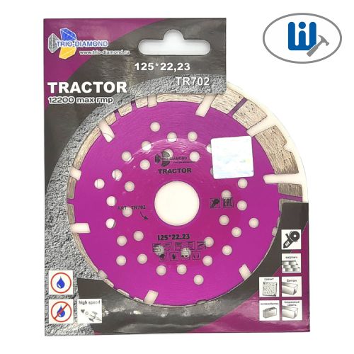 Алмазный диск Trio Diamond Tractor 125 мм - выполнен методом горячего прессования. Диск используется для резки железобетона, бетона, бордюрного камня, натурального камня, тротуарной плитки, кирпича. Высота алмазного слоя составляет 12 мм. Посадочное отверстие - 22,23 мм. Рифлёные сегменты с увеличенной высотой режущей кромки обеспечивают высокую скорость реза, перфорация корпуса способствует дополнительному охлаждению диска. Диск подходит для работы на УШМ.