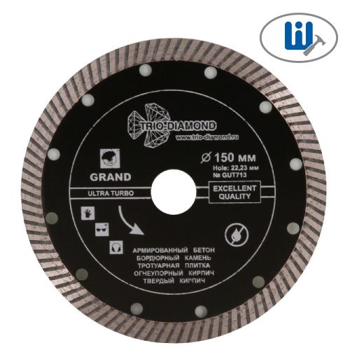 Алмазный диск Trio Diamond Grand Ultra Turbo 150 мм- изготовлен методом горячего прессования. Используется для резки гранита, армированного бетона, бетона, железобетона и огнеупоров. Толщина алмазного слоя 2,3 мм, а высота 10 мм. Посадочное отверстие - 22,23 мм. Глубина реза составляет 30 мм. Сплошная турбо кромка обеспечивает чистый рез без сколов. Диск подходит для работы на УШМ.