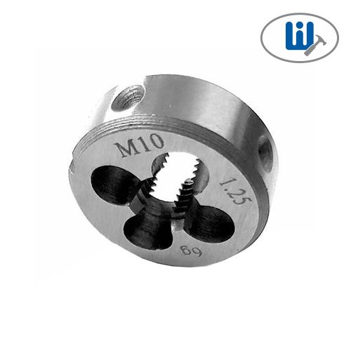 Плашка М10 х 1,25 мм является резьбонарезным инструментом. Для обеспечения прочности изделие изготовлено из инструментальной стали. По специальным отверстиям происходит отвод стружки.