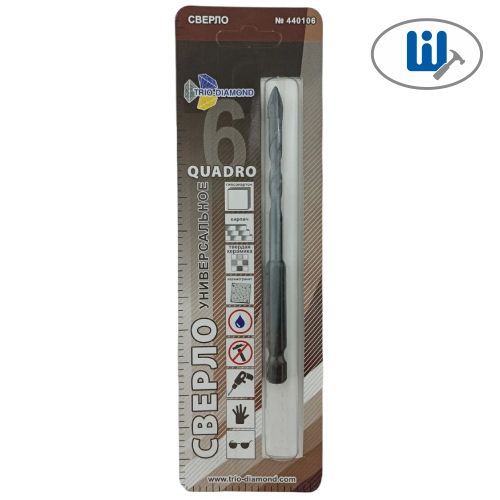 Сверло универсальное квадро Trio Diamond 6 мм - используется для сверления отверстий в керамогранит, твердая керамика, кирпич, гипсокартон. Диаметр сверла 6 мм. Тип хвостовика - 1/4HEX - E. Сверло имеет два лезвия (4В). Сверление осуществляется с применением водяного охлаждения. Подходит для работы шуруповертом, дрелью в безударном режиме.